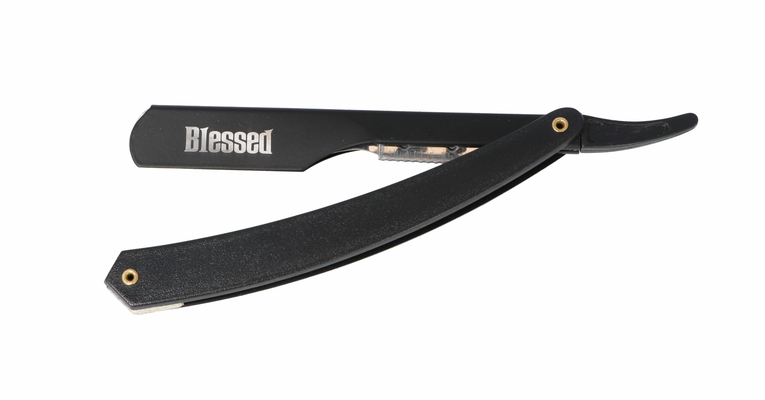 Navaja de carril Blessed con mango de plástico negro, ligera y equilibrada, ideal para perfilar, sombrear y definir contornos con máxima precisión en barbería profesional.