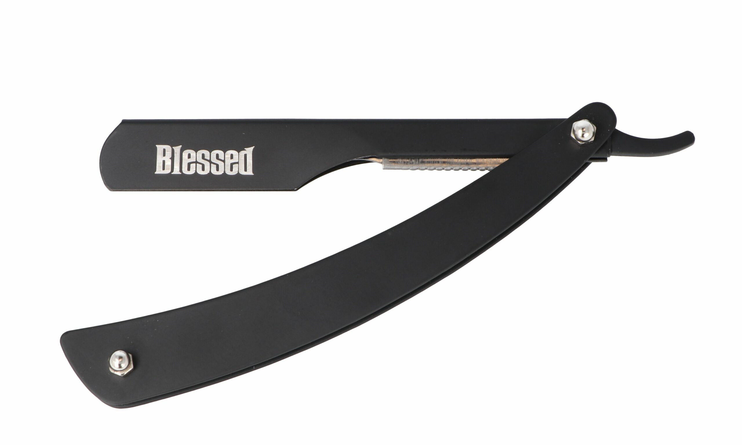 Navaja de carril negra Blessed, ligera y ergonómica, ideal para barberos profesionales. Apta para cuchillas estándar, ofrece precisión y control en cada afeitado.