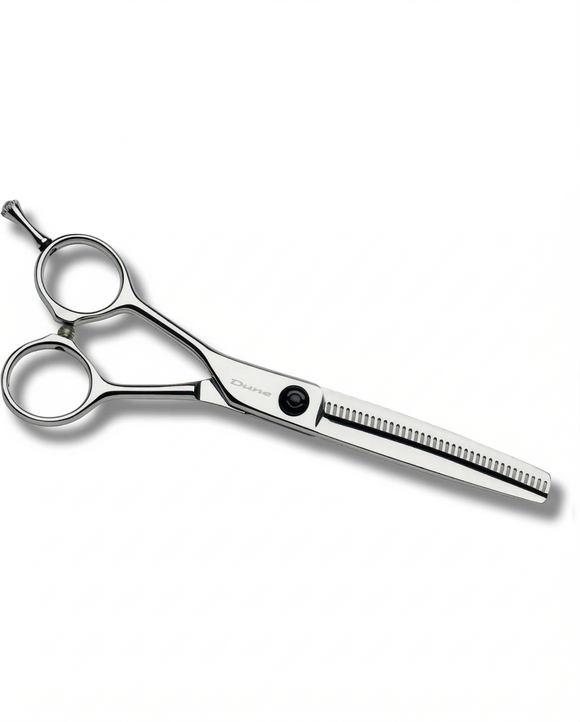 Tijera esculpidora profesional DUNE Jump 36TL para zurdos, 36 dientes, acero japonés 440C y ergonomía específica para un desfilado preciso y cómodo.