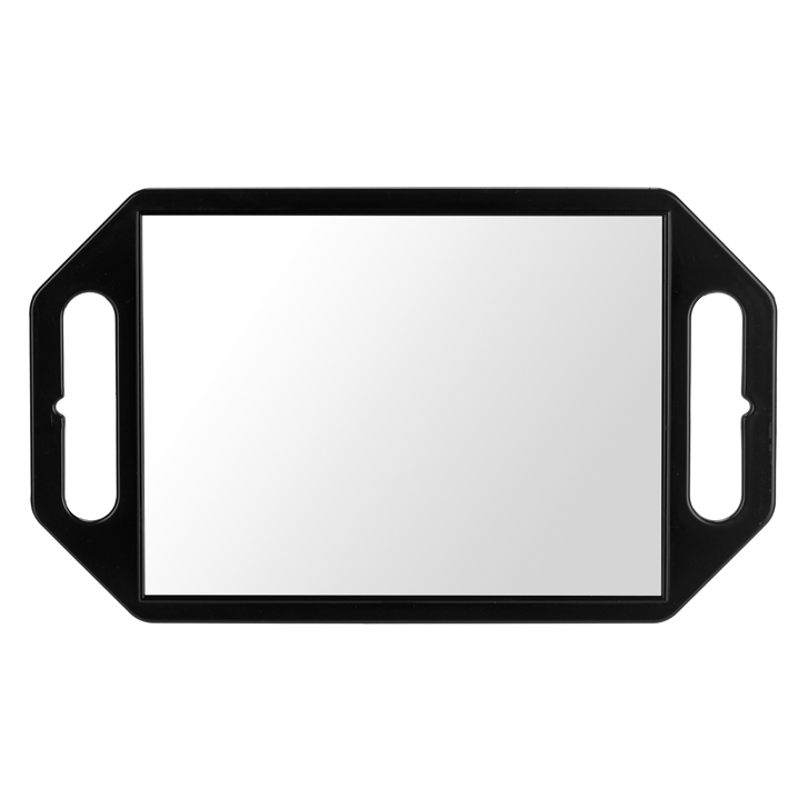 Espejo profesional Eurostil con asas negras, ligero y resistente, ideal para mostrar al cliente el resultado de cortes, peinados y coloraciones en peluquerías y barberías.