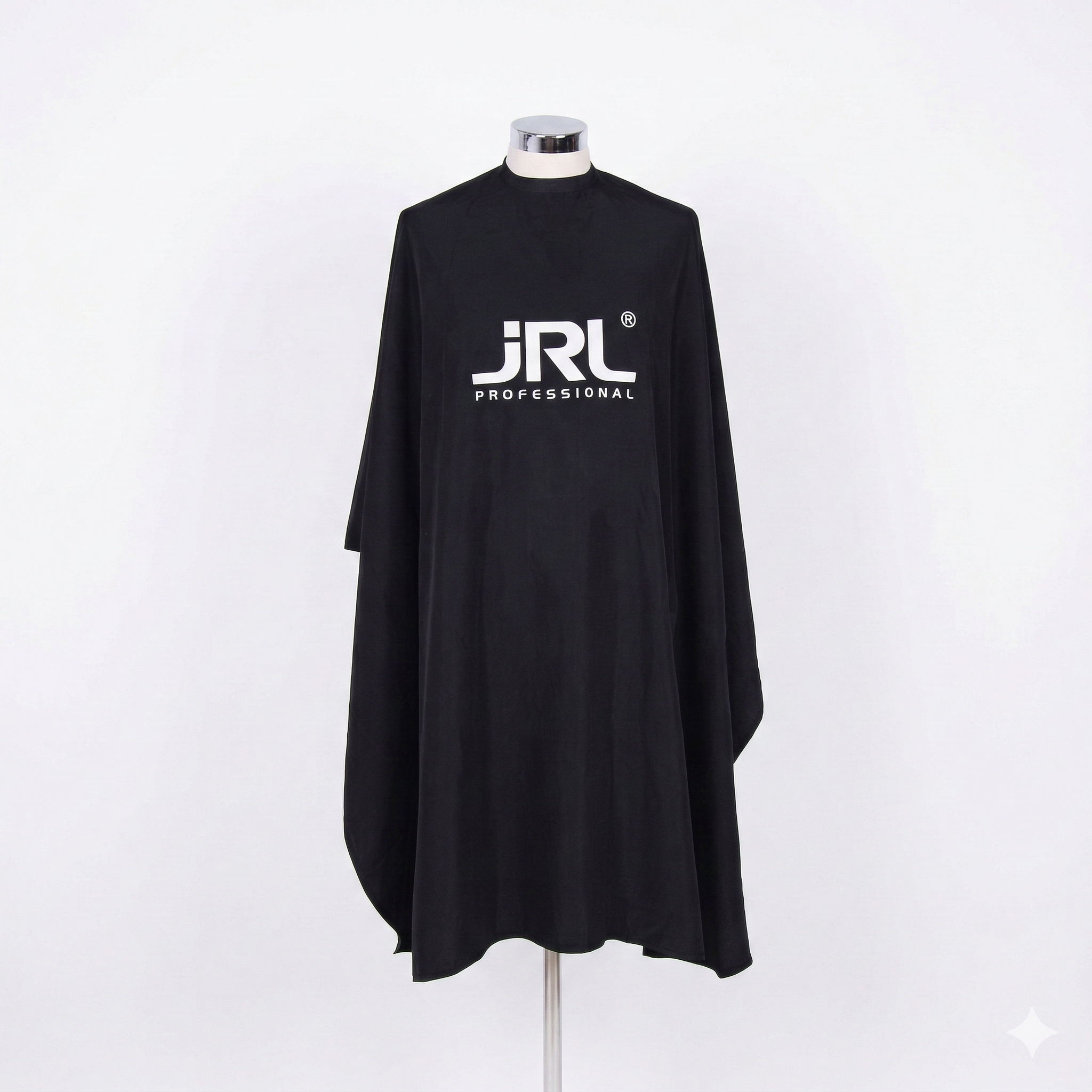 Capa de corte profesional JRL negra, 144×142 cm, resistente al agua, con cierre de velcro ajustable. Ideal para peluquerías y barberías, cómoda y de fácil limpieza.