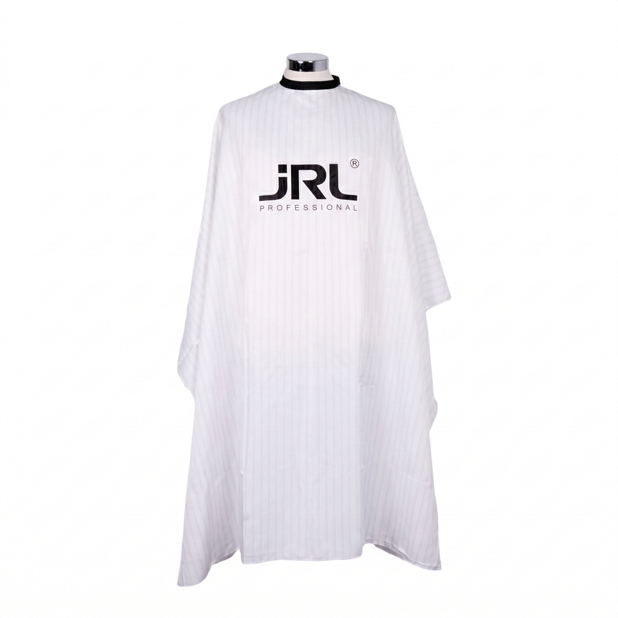 Capa de corte profesional JRL White Stripes en poliéster impermeable, cierre de velcro ajustable y diseño amplio para máxima protección en barbería y peluquería.