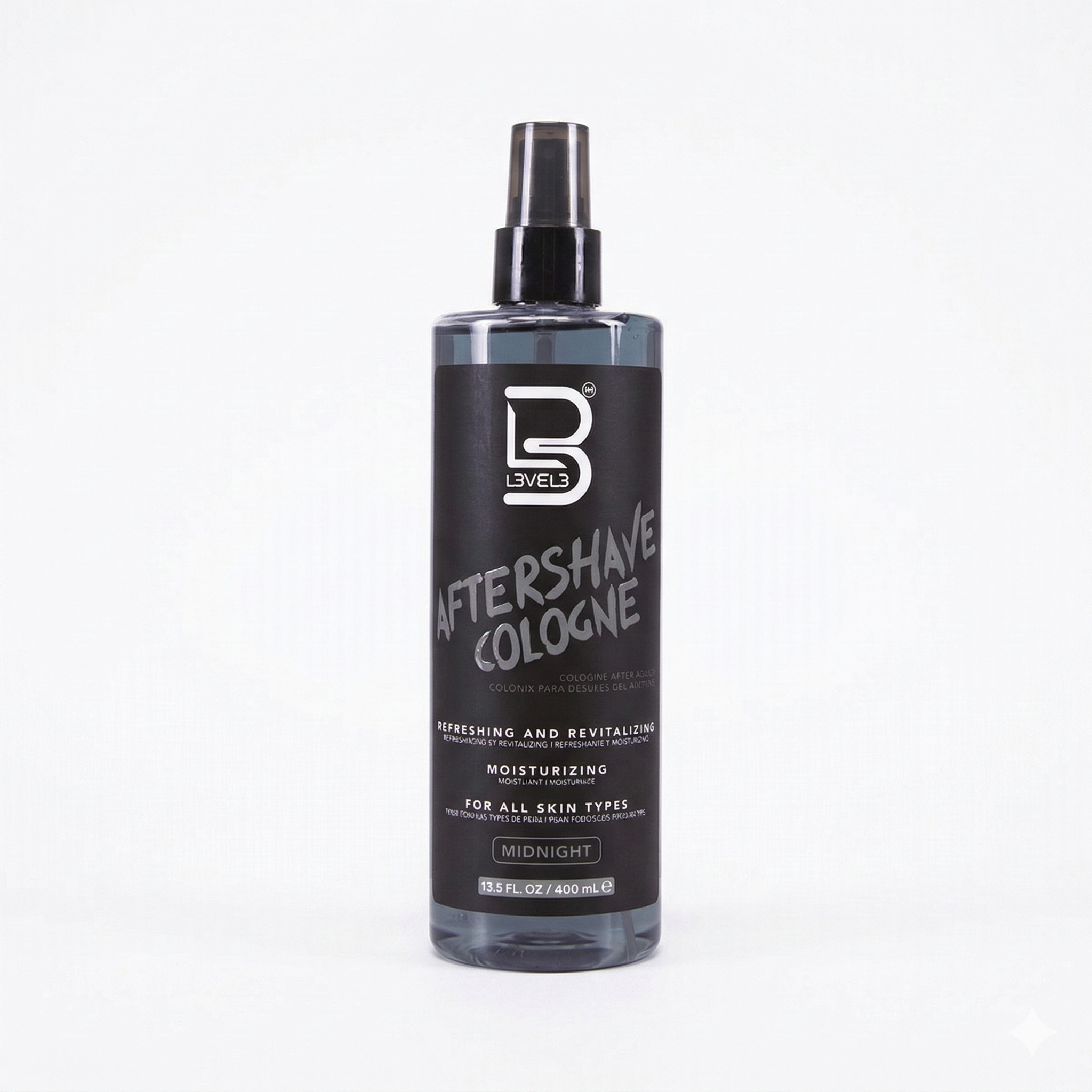 Aftershave L3VEL3 Midnight 400ml: frescor intenso y fragancia cítrico-mentolada que calma, hidrata y protege la piel tras el afeitado profesional.