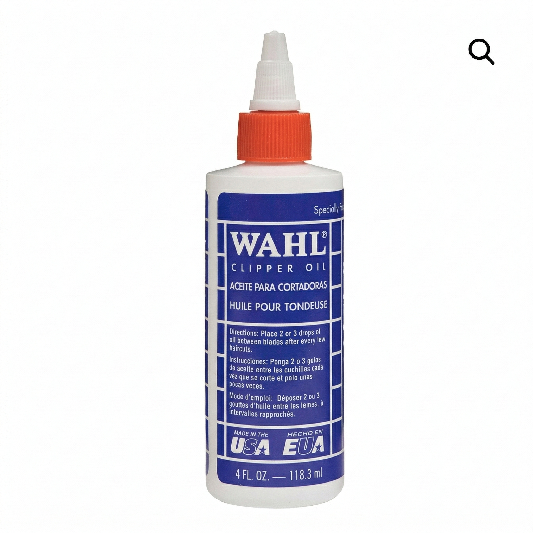 Aceite lubricante WAHL 118,3 ml para cuchillas de máquinas de corte. Reduce fricción, sobrecalentamiento y desgaste, alargando la vida útil y el rendimiento del equipo.